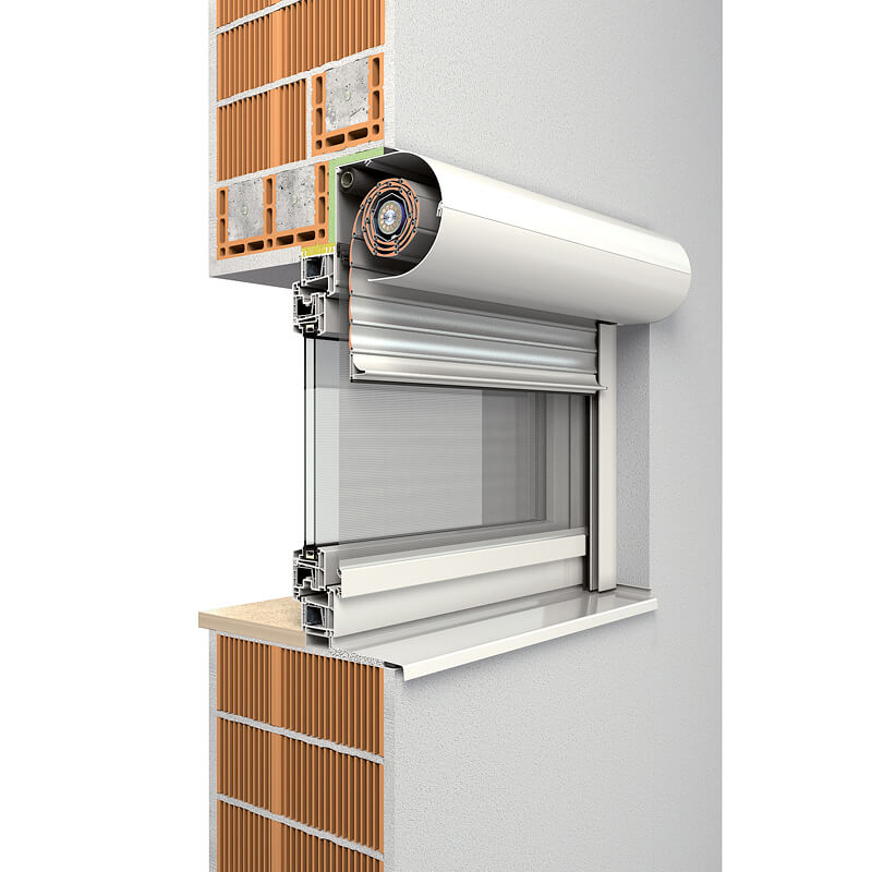 Das Rollladensystem passt sich in die Fassade ein und kann wahlweise mit eckiger oder fünfeckiger Frontblende verwendet werden.